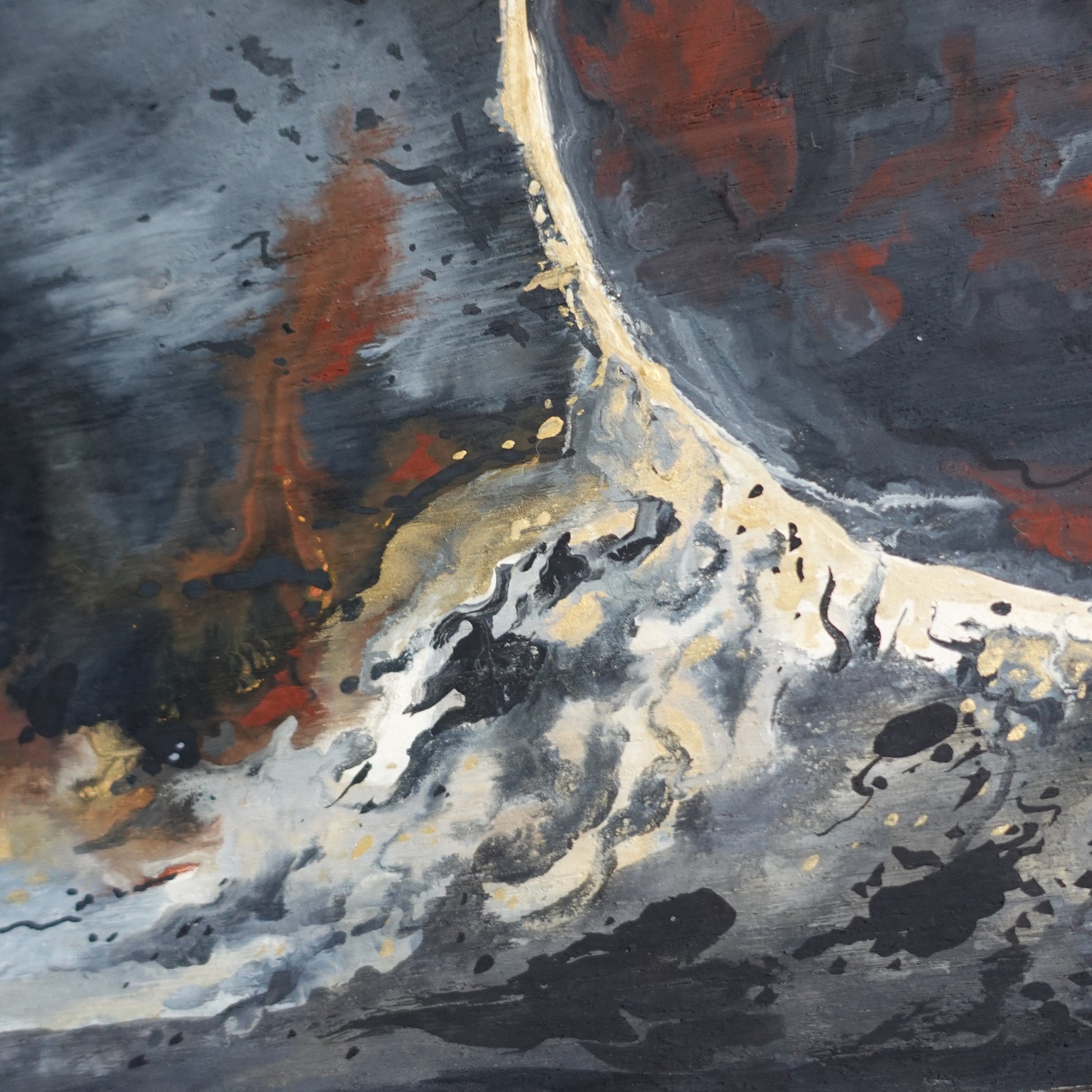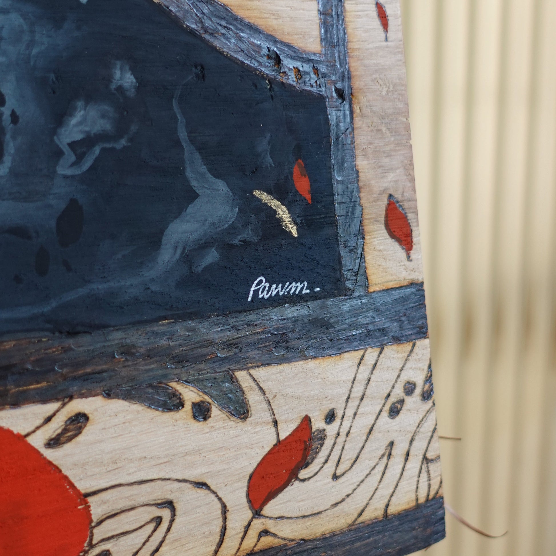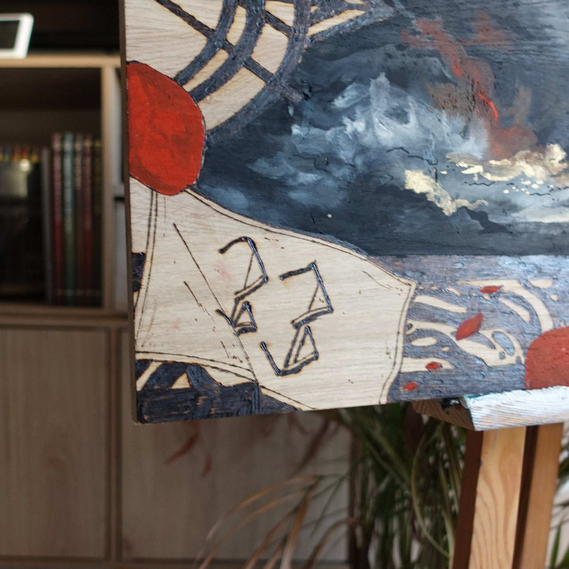 Diptyque tiré du jeux vidéo Clair Obscur : Expédition 33 fait d'un mélange de pyrogravure, gouache, crayons de couleurs et peinture dorée.