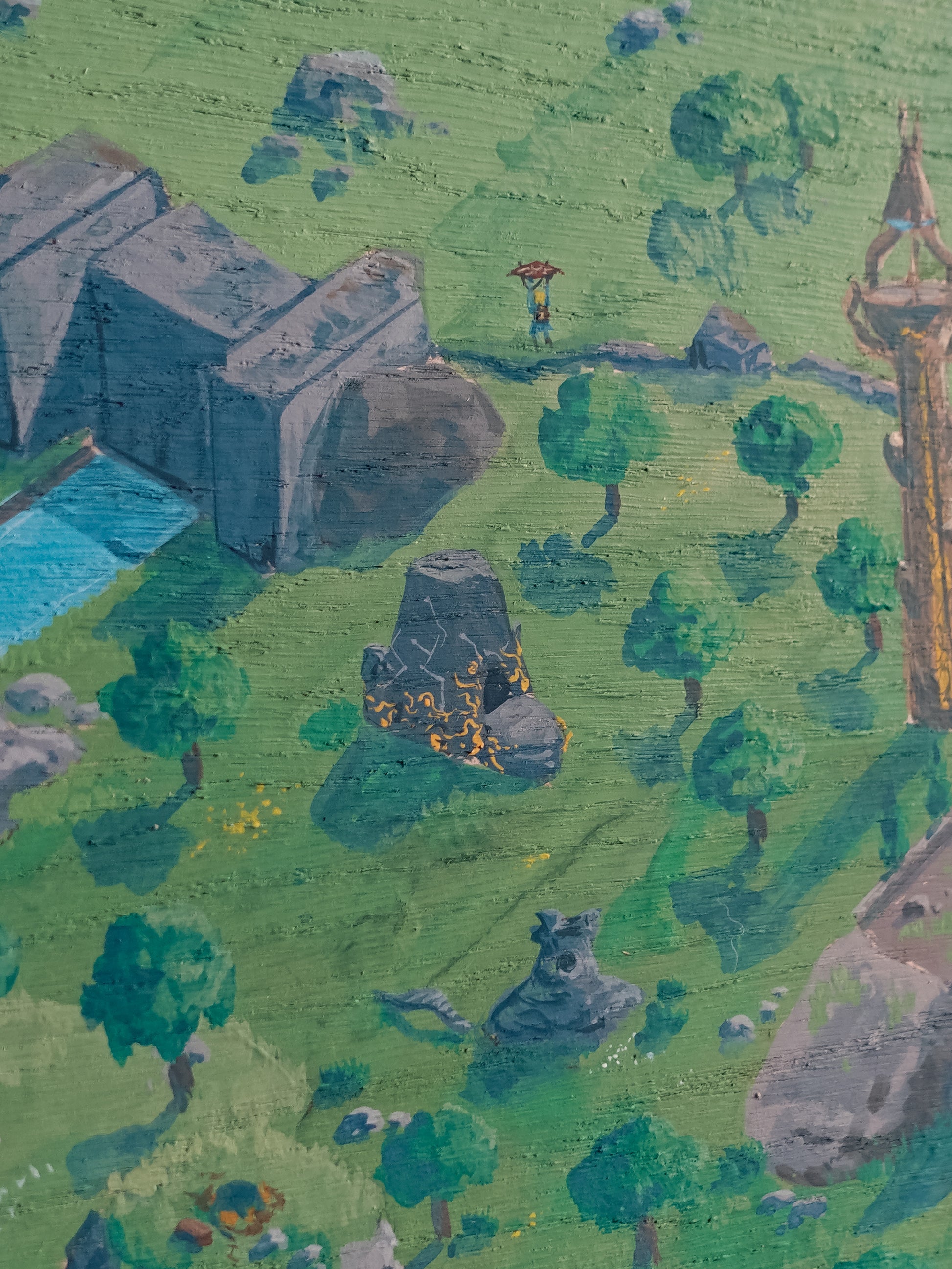 Diptyque tiré du jeu Zelda Breath of the Wild fait d'un mélange de pyrogravure, gouache et crayons de couleurs.