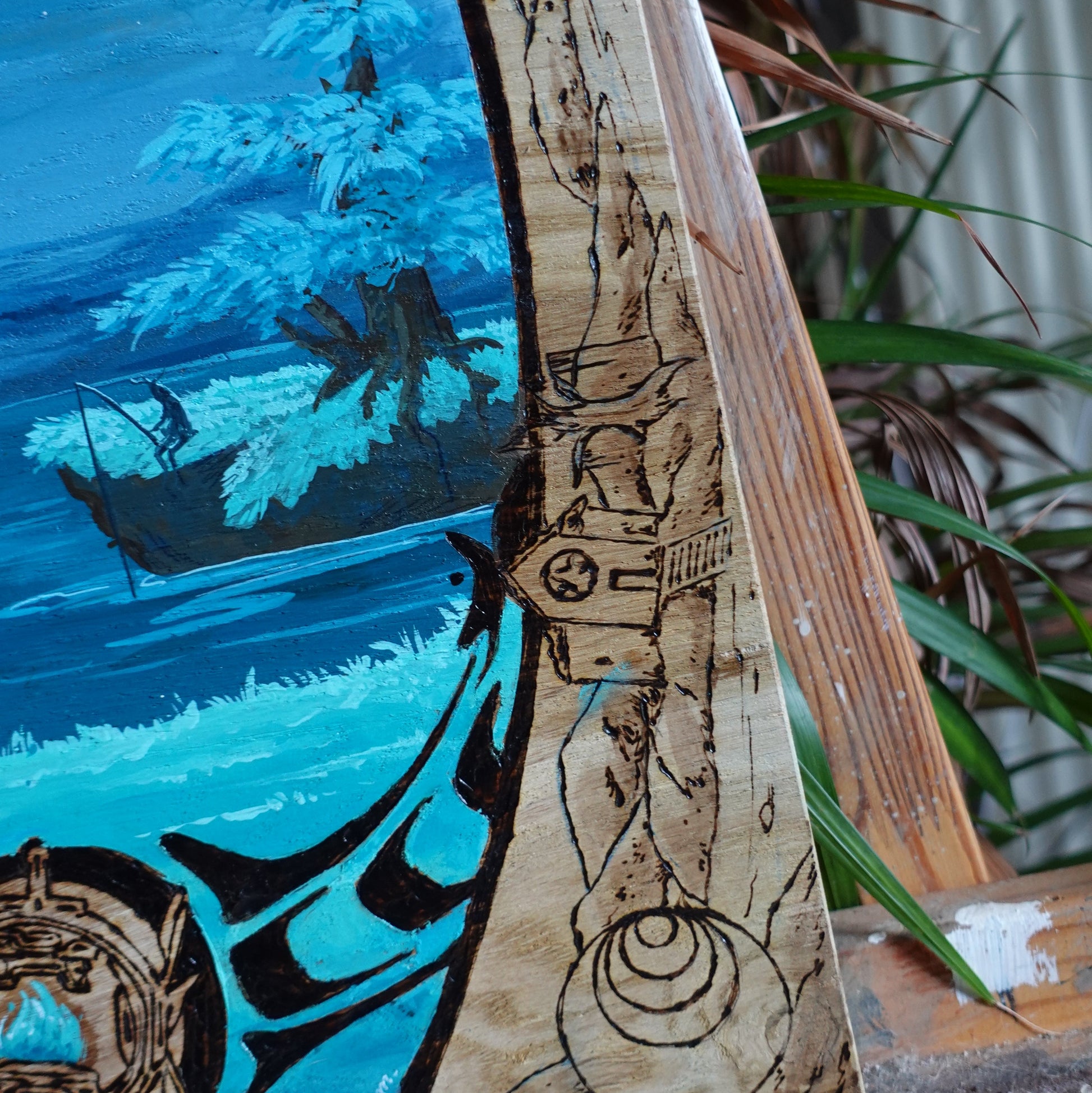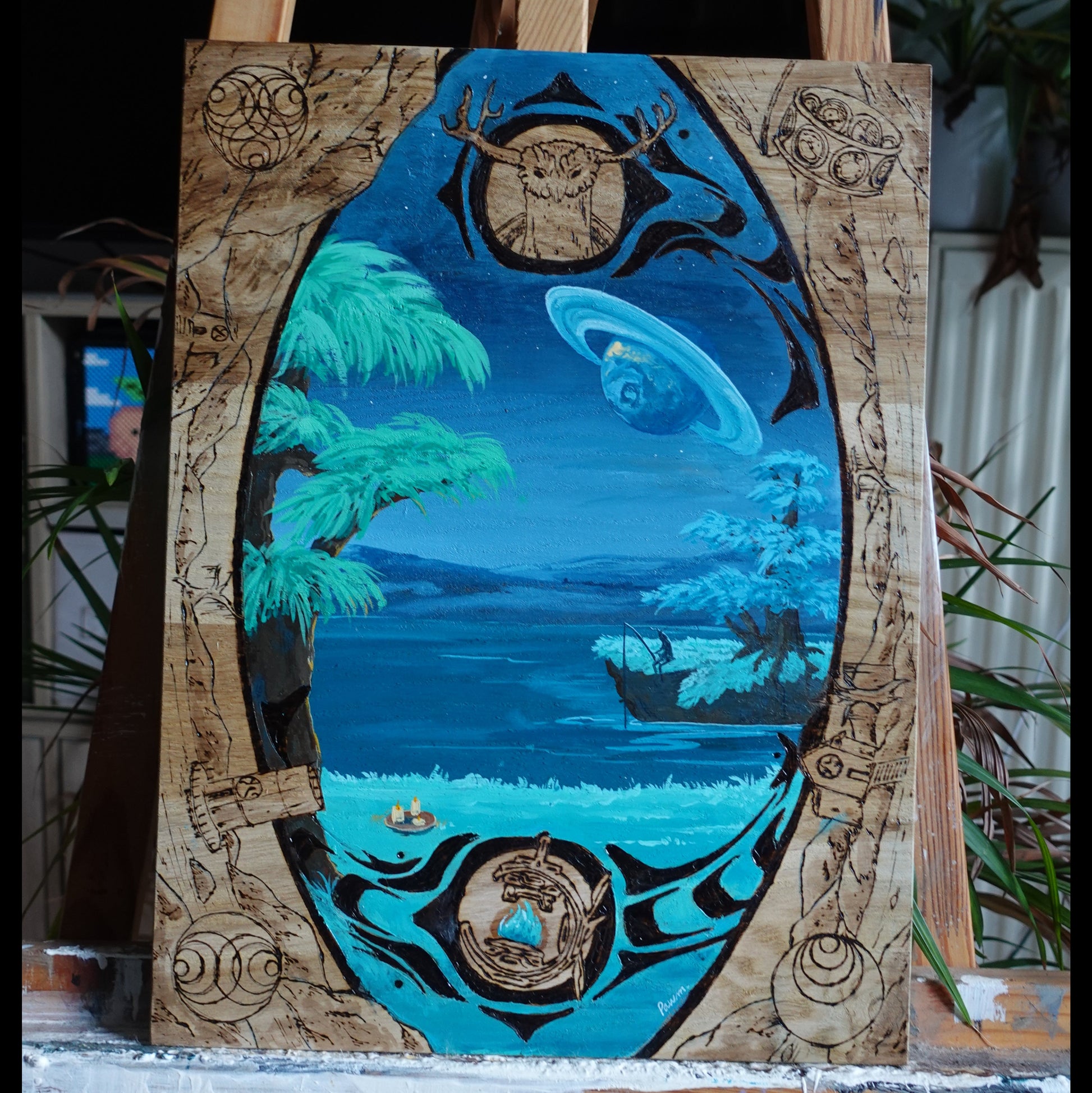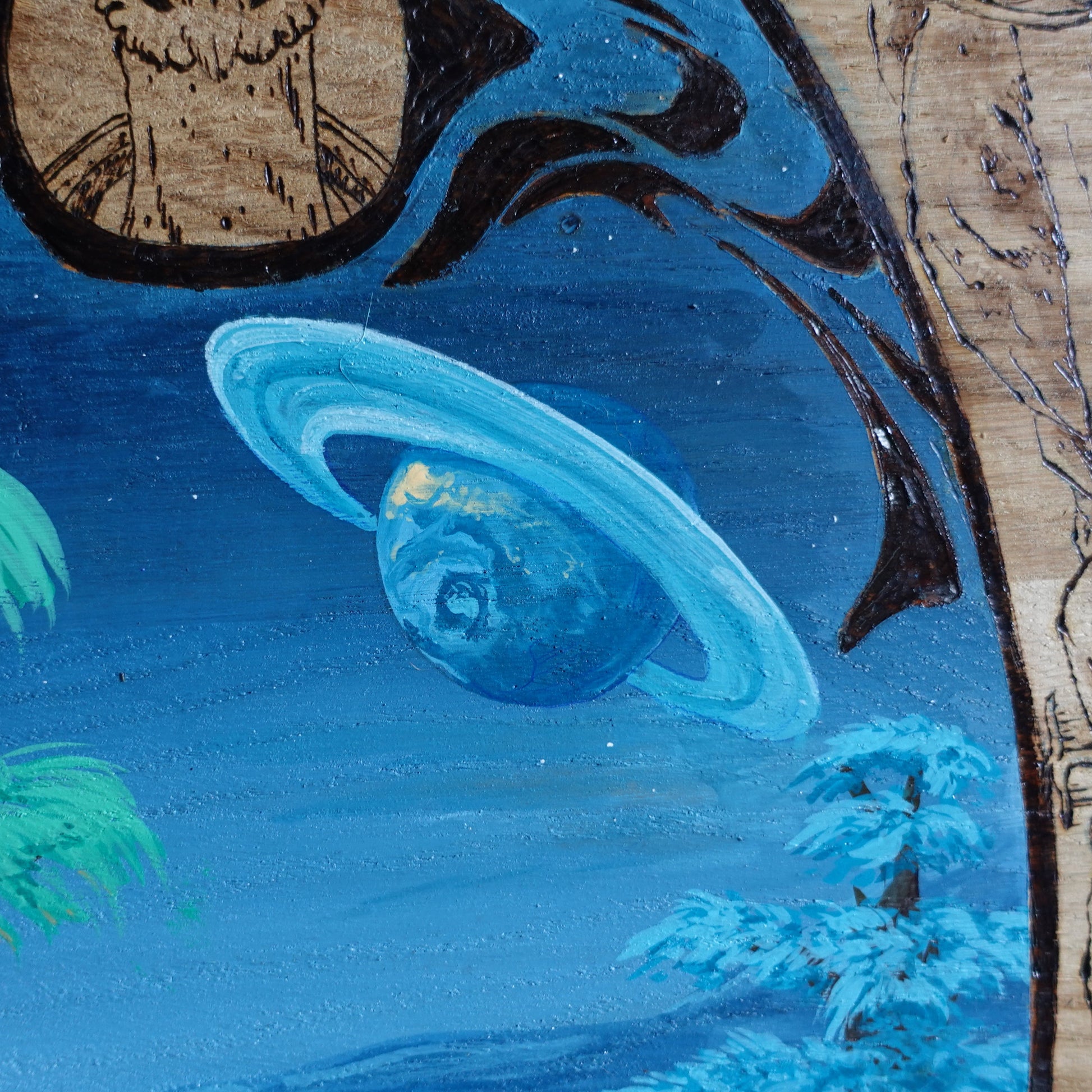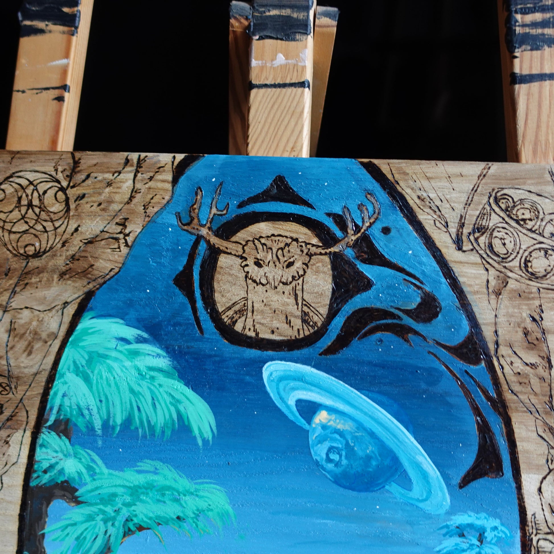 Panneau tiré du jeu Outer Wilds fait d'un mélange de pyrogravure, gouache et crayons de couleurs.